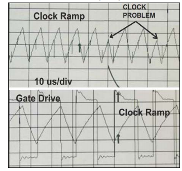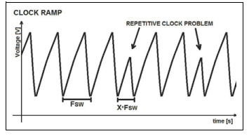 如果石英振蕩器有噪聲感應電壓在上升坡道上的尖峰,門檻將被越過早些時候,時鐘信號會比它早應該,如圖所示,這也將提前開始低坡道在圖中,這導致切換的突然變化PWM信號的頻率和高抖動,該時鐘斜坡非常容易受到PCB布局的影響芯片周圍的元件,因此,除非開關頻率在內部產生,易受影響蝕刻和元件會引入噪聲額外的抖動,這種行為可以避免,或者至少可以避免通過遵循適當的SMPS布局規(guī)則最小化.