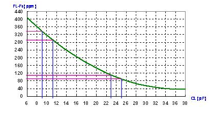 在圖中, CL=24 pF 時(shí)的頻率敏感度是10 ppm/pF, 及CL=10 pF時(shí)的頻率敏感度是20 ppm/pF. 在并聯(lián)線路中, 負(fù)載電容越小, 頻率對負(fù)載電容變化的敏感度越高. 相反的, 負(fù)載電容越大, 頻率對負(fù)載電容變化的敏感度越低. 這就是石英晶體共振子用于VCXO線路上時(shí), 線路設(shè)計(jì)上會(huì)選用較小負(fù)載電容. 反之, 在要求較準(zhǔn)確的頻率信號時(shí), 線路設(shè)計(jì)上會(huì)選用較高的負(fù)載電容.