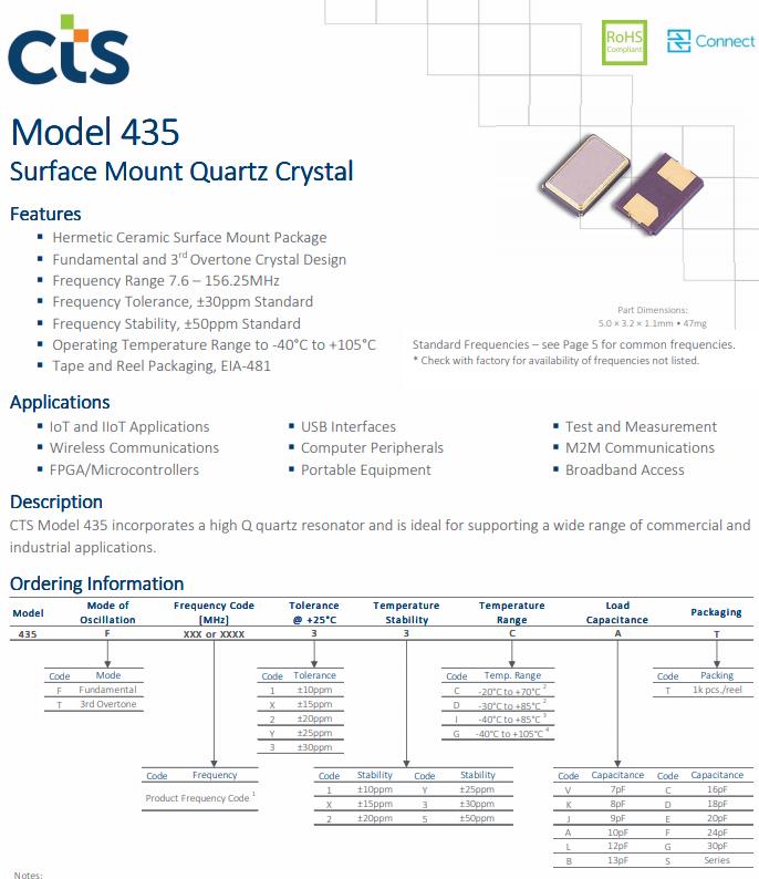 CTS晶振公司推出的435型的標準產(chǎn)品特性和常見市場應用總結(jié)如下。