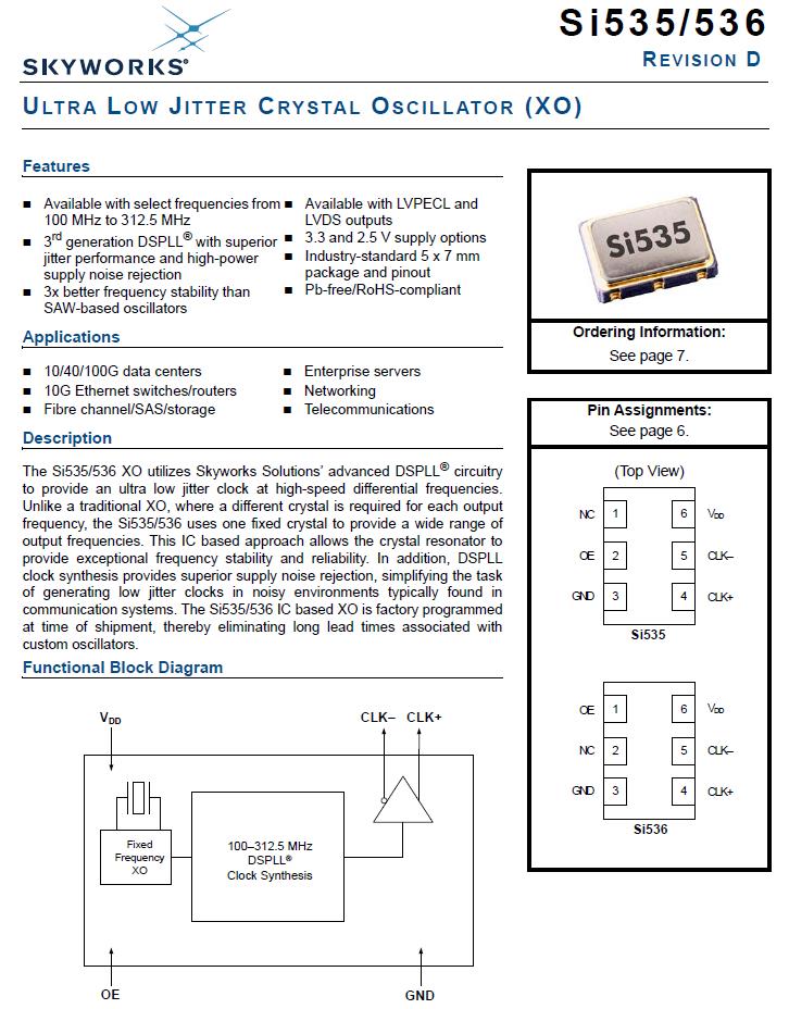 編碼536BB156M250DG,頻率為156.25MHz,Si535/536 XO時(shí)鐘振蕩器,OSC石英晶體振蕩器,采用Skyworks Solutions先進(jìn)的DSPLL®電路在高速差分頻率下提供超低抖動(dòng)時(shí)鐘。不像傳統(tǒng)的XO,每個(gè)輸出都需要不同的晶體頻率,Si535/536使用一個(gè)固定晶體提供廣泛的輸出頻率。這種基于集成電路的方法允許晶體諧振器提供卓越的頻率穩(wěn)定性和可靠性。此外,DSPLL時(shí)鐘合成提供了優(yōu)越的電源噪聲抑制,簡化了任務(wù)在嘈雜的環(huán)境中產(chǎn)生低抖動(dòng)時(shí)鐘的方法通信系統(tǒng)?;赟i535/536 IC的XO是工廠編程的在發(fā)貨時(shí),從而消除了較長的交貨時(shí)間定制的振蕩器。