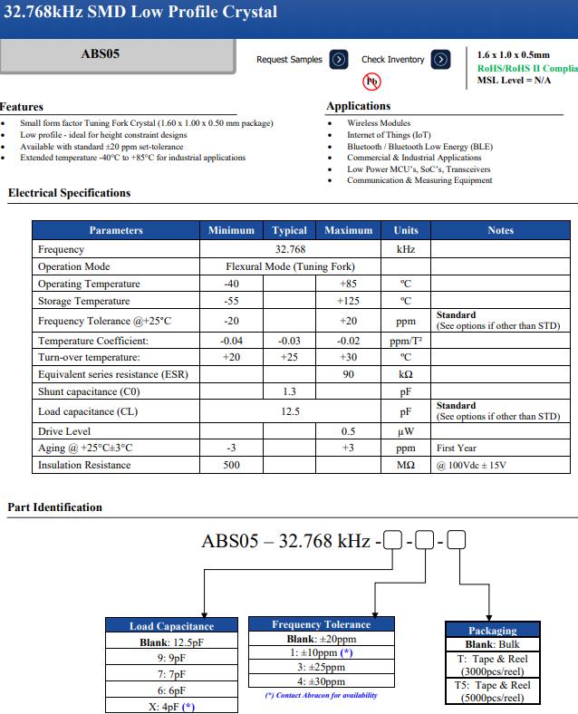 編碼ABS05-32.768KHZ-T,SMD晶振,小尺寸音叉晶體(1.60 x 1.00 x 0.50mm包裝),低輪廓-理想的高度限制設計,可提供標準±20ppm設置公差,工業(yè)應用擴展溫度-40°C至+85°C,應用范圍:無線模塊,物聯(lián)網,藍牙/藍牙低能量(BLE),商業(yè)和工業(yè)應用,低功耗MCU, SoC,收發(fā)器,通信和測量設備