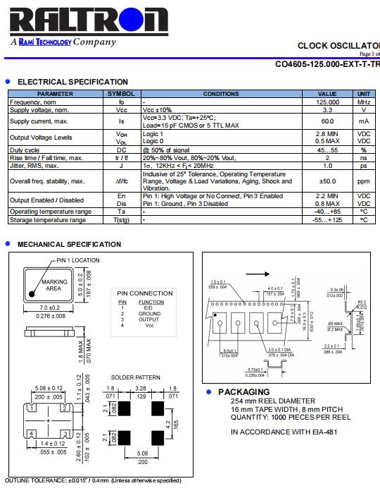| CO46 系列 125 MHz 7 x 5 mm 3.3 V ±50 ppm 表面貼裝 時(shí)鐘振蕩器 | |||||||