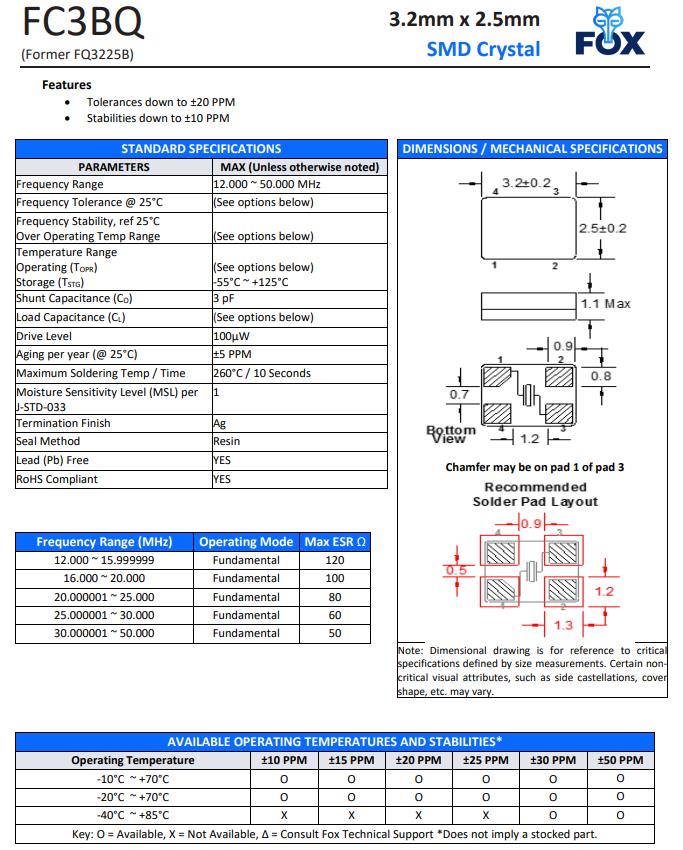 | FQ3225BR-20.000 | FOX晶振 | FQ3225B | MHz Crystal | 20MHz | ±50ppm |