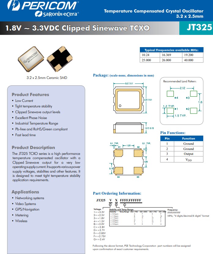 亞陶晶振JT325TCXO系列是一款高性能溫度補(bǔ)償振蕩器,具有削波正弦波輸出,可實現(xiàn)非常低的工作電源電流.它支持各種電源電壓、穩(wěn)定性和其他功能.它旨在滿足嚴(yán)格的溫度穩(wěn)定性應(yīng)用要求.