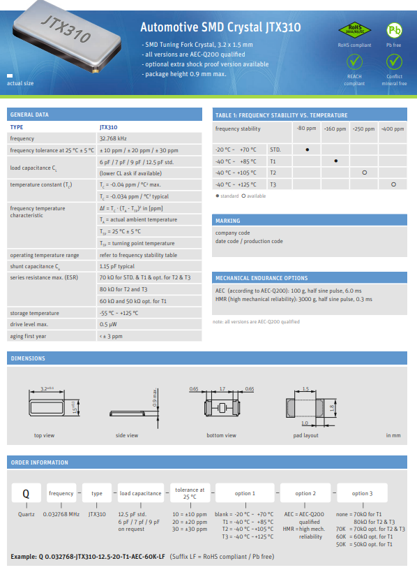 Q 0.032768-JTX310-7-20-T3-HMR-LF 3215 32.768K 7PF -40+125℃車規(guī)Jauch晶振