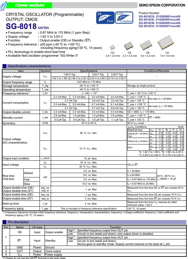 | X1G005581002800 | SG-8018CB | 10.000000 MHz | 5.00 x 3.20 x 1.30 mm | CMOS | 1.620 to 3.630 V | -40 to 105 °C | +/-50 ppm |