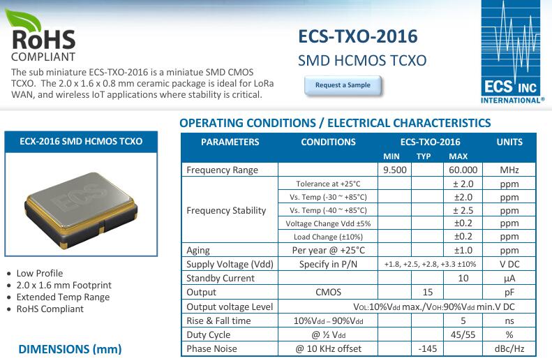 晶振之重,在于其為物聯(lián)網(wǎng)設備提供“心跳”般的精準時鐘信號.作為一款溫補晶振(TCXO),ECS-TXO-2016最亮眼的特質(zhì)便是-40~+85℃寬溫范圍內(nèi)2.5ppm的頻率穩(wěn)定度.這一精度意味著在極寒的極地探測或高溫的工業(yè)車間,設備時鐘誤差仍能控制在極低范圍.LoRaWAN等無線通信技術對時序同步要求嚴苛,正是這種穩(wěn)定性讓遠程數(shù)據(jù)傳輸精準無誤,避免了因時鐘偏差導致的信號失真或數(shù)據(jù)丟失,成為物聯(lián)網(wǎng)可靠運行的“定盤星”.